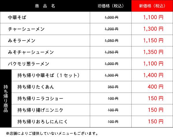 弊社ではご来店いただく皆様にご満足いただけるようにメニュー価格の維持に努めて参りましたが、相次ぐ原材料費の高騰および人件費の上昇により従来の価格維持が困難な状況となり、価格を維持するためにスープの内容量を減らすよりも、更にスープの質を充実させる選択をし、誠に不本意ではございますが一部メニューの価格改定をさせていただきます。